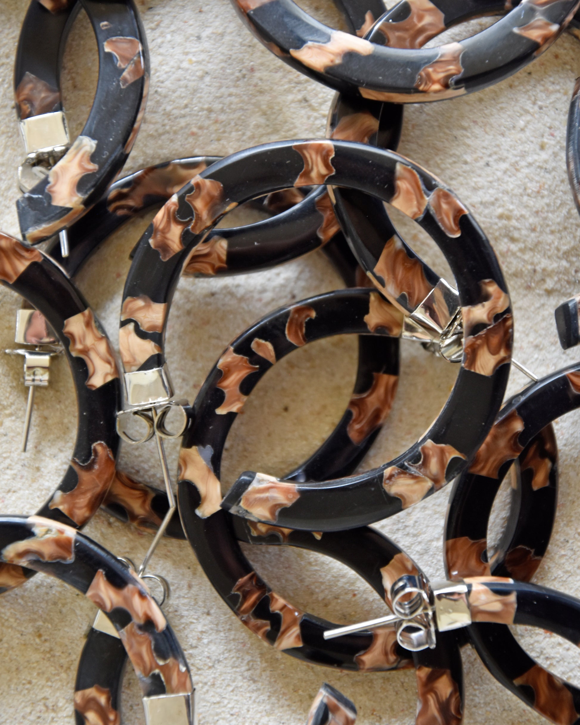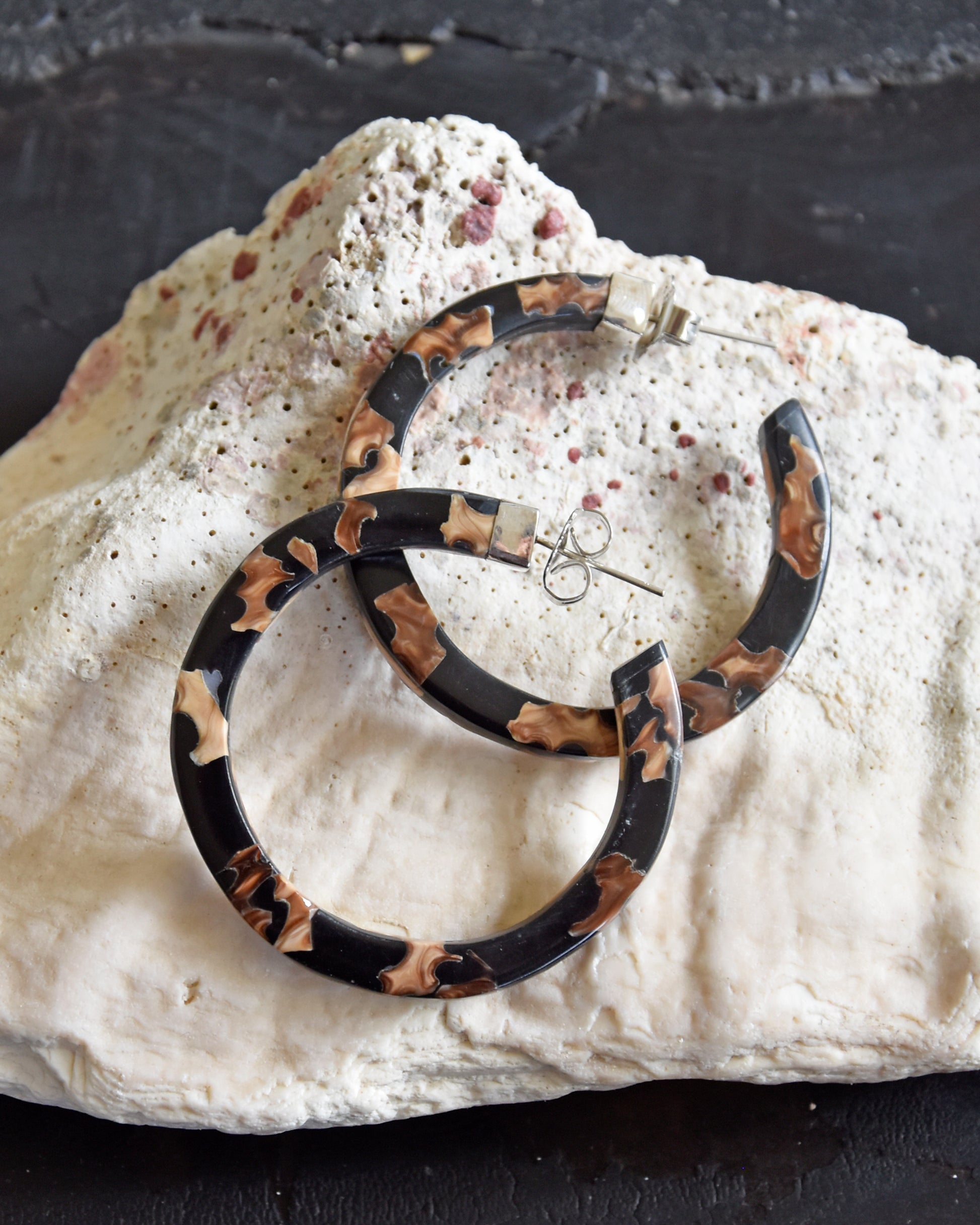 Preciosas y originales argollas de conchas negra y resina trabajado a mano con Plata 925. Tonos camel y negros que combinan con todo.