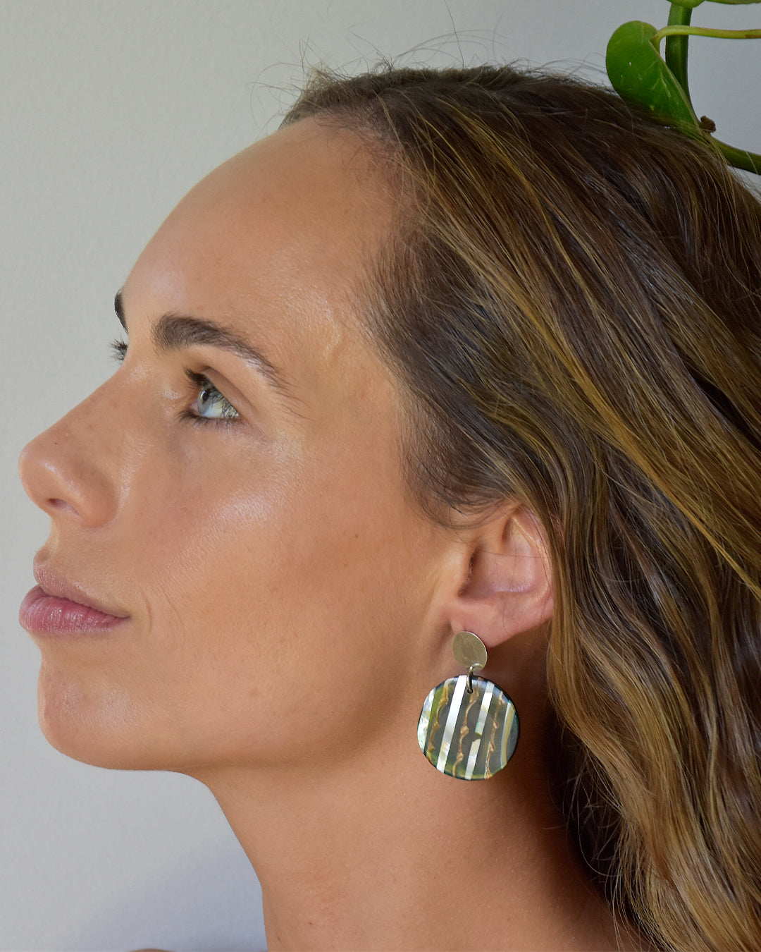 Nuestros clásicos aros hechos a mano, elaborados con conchas y resina, sobre una base de 100% plata 925. Aportan un toque luminoso y único a tu look.