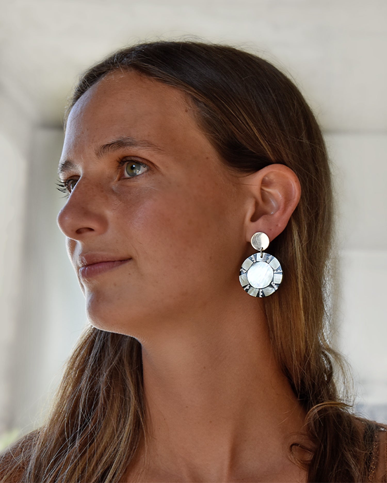 Nuestros clásicos aros hechos a mano, elaborados con conchas y resina, sobre una base de 100% plata 925. Aportan un toque luminoso y único a tu look.