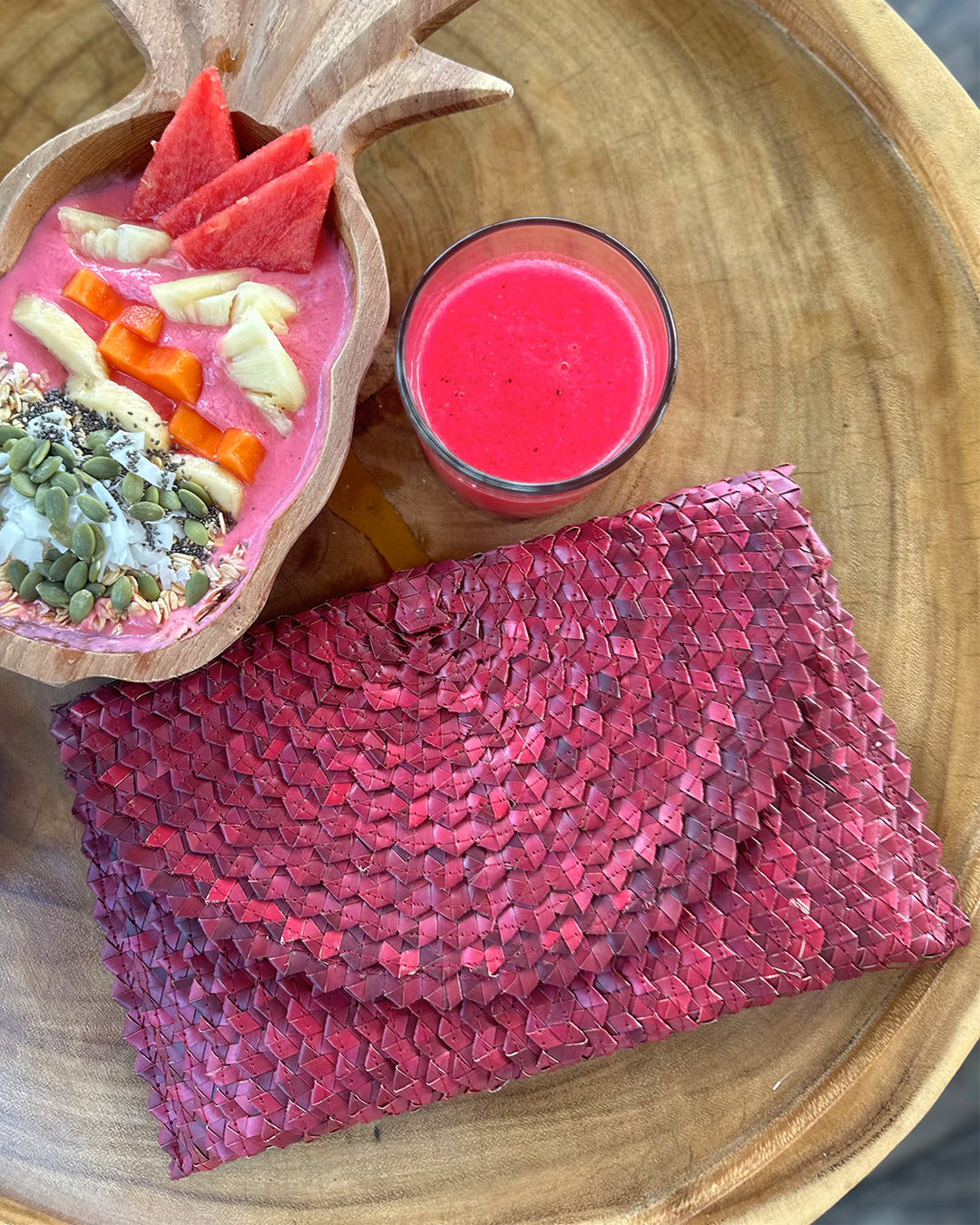 Nuestro sobre pouch es tejido en fibra de plátano por artesanos en Bali. Es ideal para llevar a un evento, a la playa y para guardar accesorios. Tiene forro interior y broche.