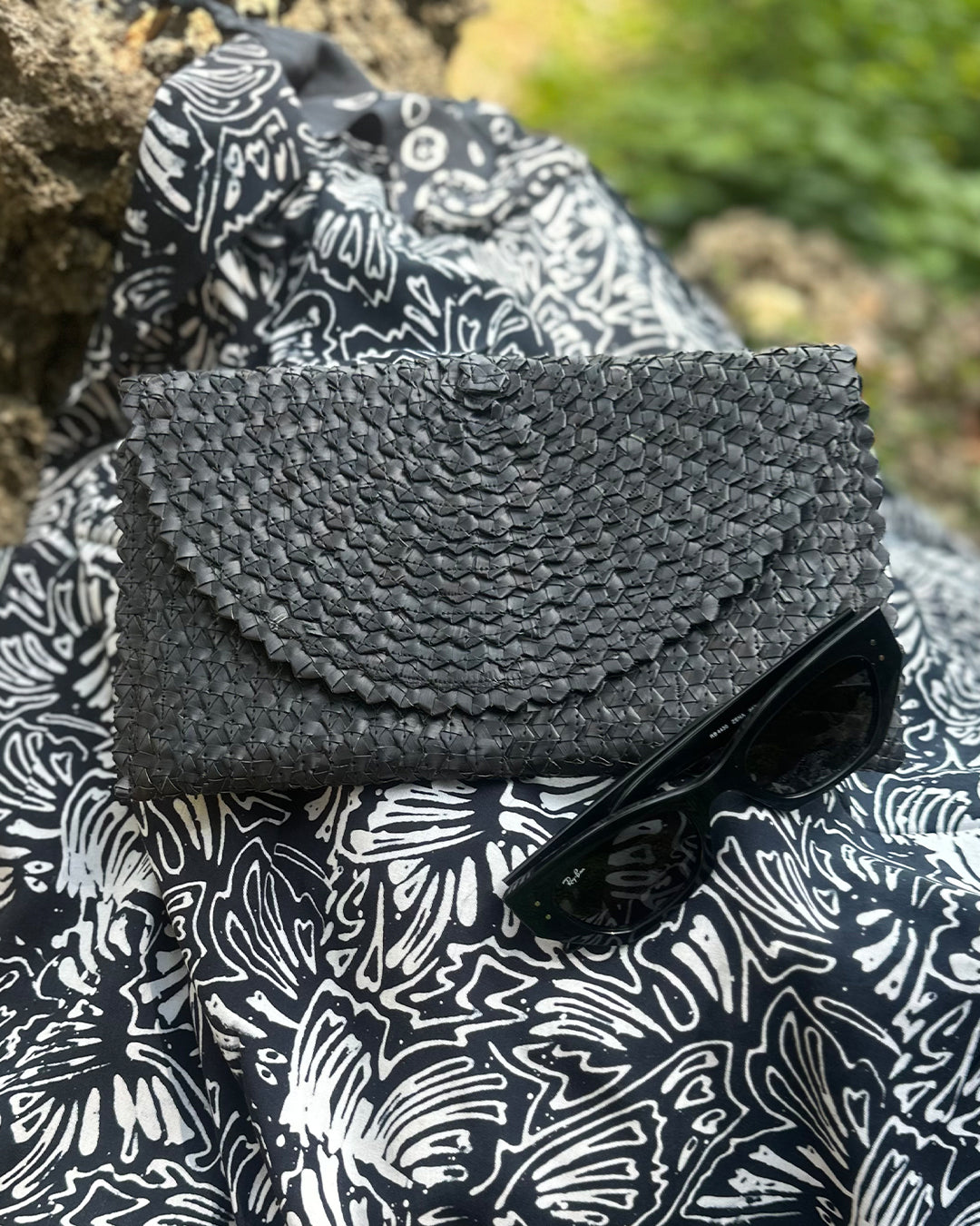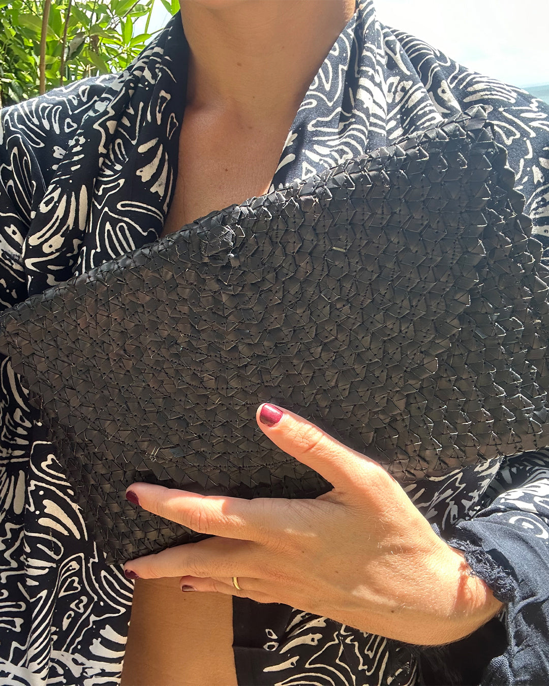 Nuestro sobre pouch es tejido en fibra de plátano por artesanos en Bali. Es ideal para llevar a un evento, a la playa y para guardar accesorios. Tiene forro interior y broche.